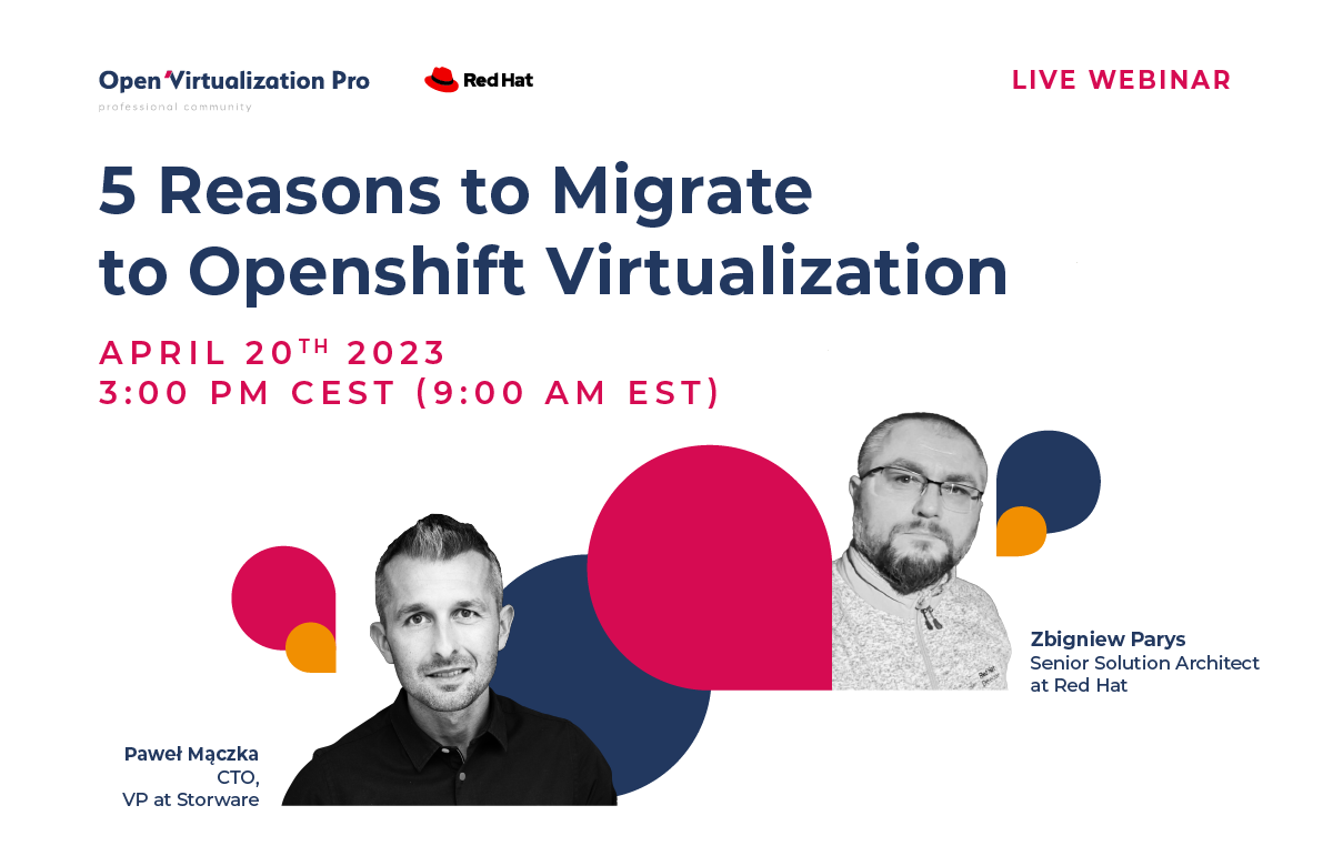 We are excited to announce an upcoming webinar that will take place on April 20th, featuring Paweł Mączka, Chief Technology Officer, VP at Storware and Zbigniew Parys, Senior Solution Architect at Red Hat. The webinar will focus on OpenShift Virtualization, an add-on to OpenShift Container Platform that enables the running and managing of virtual machine workloads alongside container workloads.